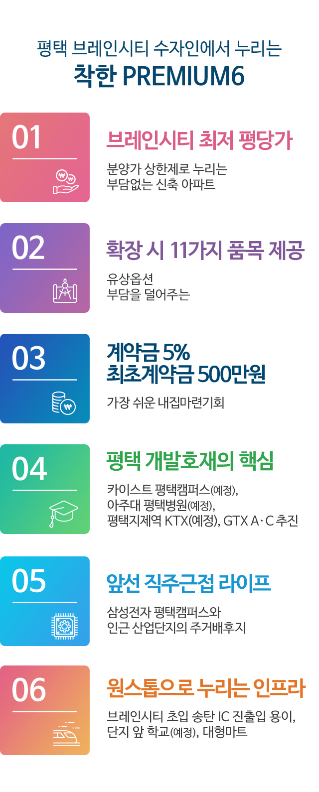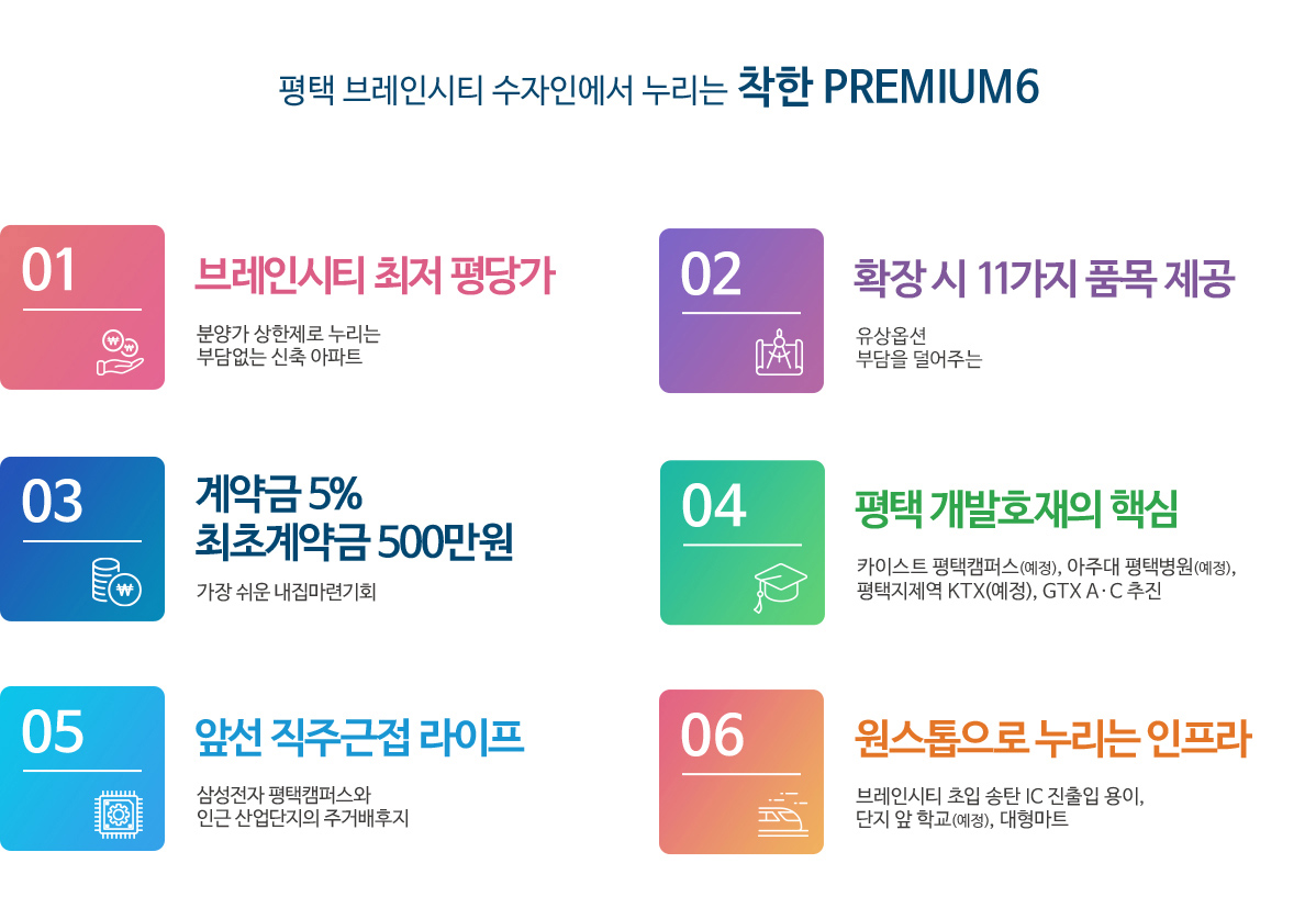 ※ 브레인시티 내 학교 및 시설에 대한 내용은 평택도시공사 브레인시티 공식 홈페이지 내 토지이용계획을 근거로 한 내용이며, 추후 관계기관 및 지자체의 계획변경에 따라 용도 변경 및 취소될 수 있습니다.